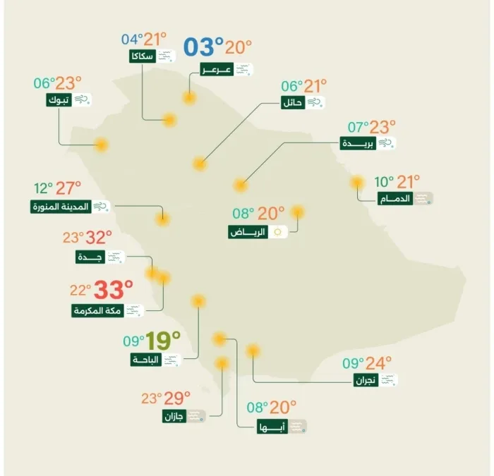 وفي سياق متصل، يشير المشهد الجوي في مناطق أخرى إلى سيطرة الرياح النشطة التي قد تشتد سرعتها لتشمل نطاقاً واسعاً يضم الرياض والقصيم وحائل، وتمتد شمالاً نحو الحدود الشمالية، وجنوباً باتجاه منطقة نجران، مما يوجب الانتباه لحركة التيارات الهوائية في تلك المناطق طوال اليوم.