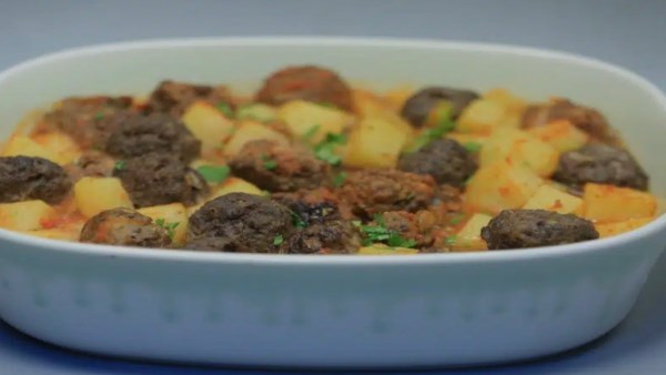 تبدأ خطوات التحضير بوضع اللحم المفروم في وعاء عميق وخلطه جيداً مع البصل ومجموعة التوابل المخصصة له حتى تتداخل المكونات تماماً، ثم يتم تشكيل العجينة على هيئة كرات متوسطة وتُغطى بطبقة خفيفة من الدقيق قبل تحميرها في الزيت لتكتسب لوناً ذهبياً وقواماً متماسكاً. بعد الانتهاء من تحضير اللحم، تُضاف إليه مكعبات البطاطس وصلصة الطماطم مع الثوم والزبدة والفلفل الرومي وباقي التوابل، ويُقلب المزيج جيداً. أخيراً، يُنقل الخليط بالكامل إلى طاجن فخاري أو صينية مناسبة، ويُدخل إلى فرن ساخن مسبقاً، حيث يُترك حتى تمام النضج وتسبك الصلصة، ليُقدم ساخناً كوجبة متكاملة ولذيذة.