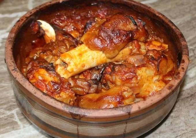 بعد ذلك، تضاف الطماطم المبشورة ومعجون صلصة الطماطم مع رشة صغيرة من السكر لضبط الطعم، ثم توضع السبانخ والكزبرة الخضراء لرفع القيمة الغذائية. وأخيراً، يتم دمج قطع الكوارع المسلوقة مسبقاً وحبات الحمص الناضجة مع هذا الخليط المتسبك، ويترك المزيج قليلاً لتمتزج النكهات، قبل أن يُسكب في طاجن فخاري ويوضع في فرن ساخن ليكمل نضجه وتتداخل مكوناته بشكل مثالي ليصبح جاهزاً للتقديم.