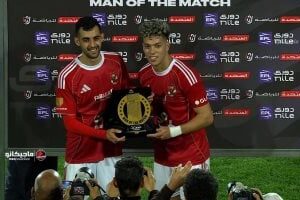 إمام عاشور يهدي جائزة رجل المباراة لزميله جمال بلعمري بعد لقاء الأهلي والجونة